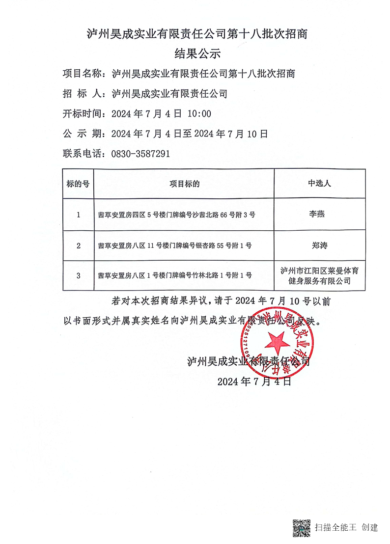 瀘州昊成實業(yè)有限責(zé)任公司第十八批次招商結(jié)果公示