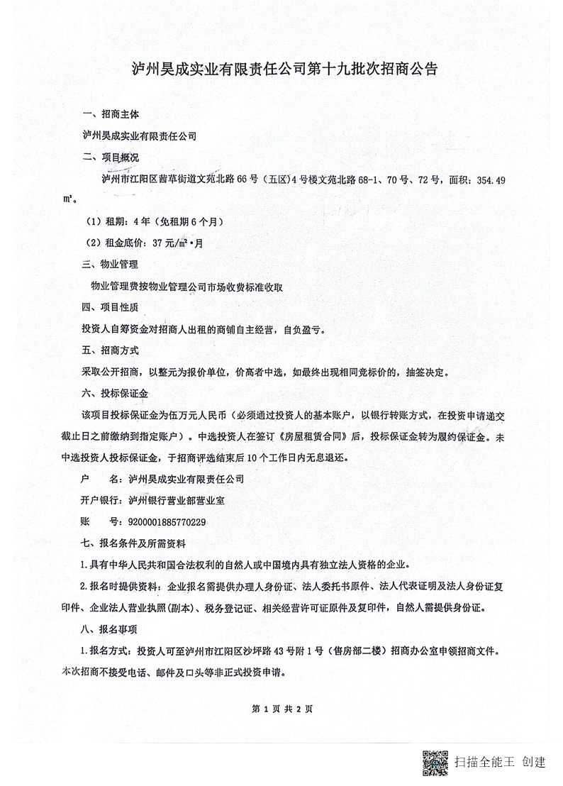 瀘州昊成實(shí)業(yè)有限責(zé)任公司第十九批次招商公告