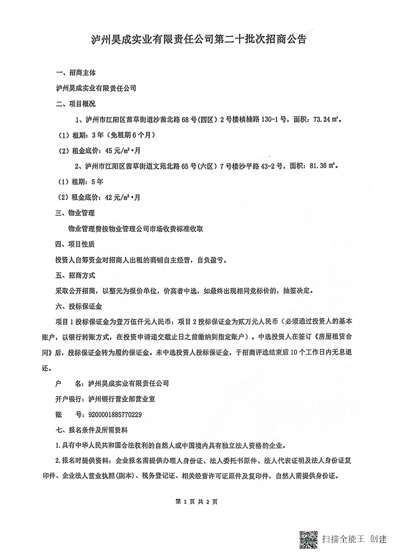 瀘州昊成實業(yè)有限責任公司第二十批次招商公告