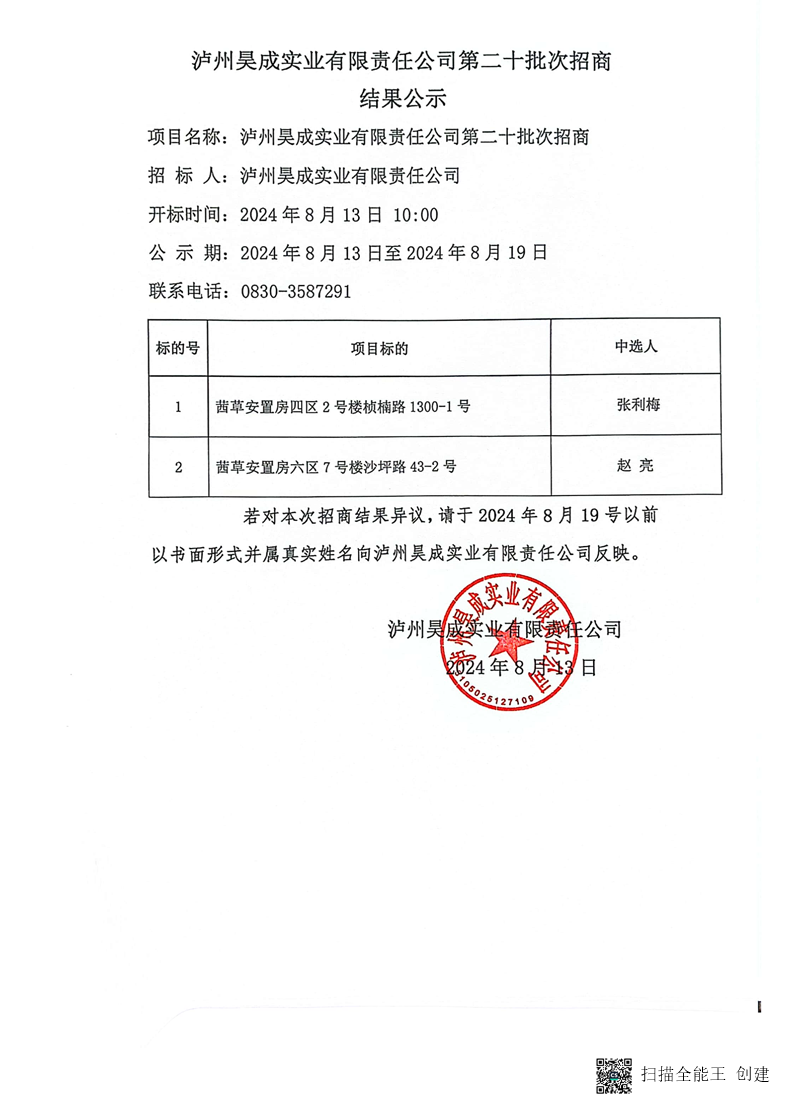 瀘州昊成實業(yè)有限責任公司第二十批次招商結果公示