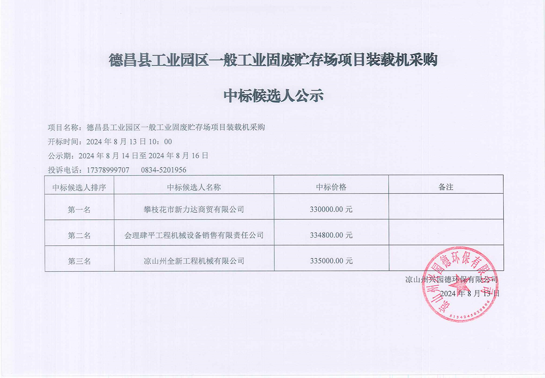 德昌縣工業(yè)園區(qū)一般工業(yè)固廢貯存場項(xiàng)目裝載機(jī)采購中標(biāo)候選人公示 作者: 來源: 日期:2024-08-13 瀏覽次數(shù): 次 【字體:小 大】 【打印正文】