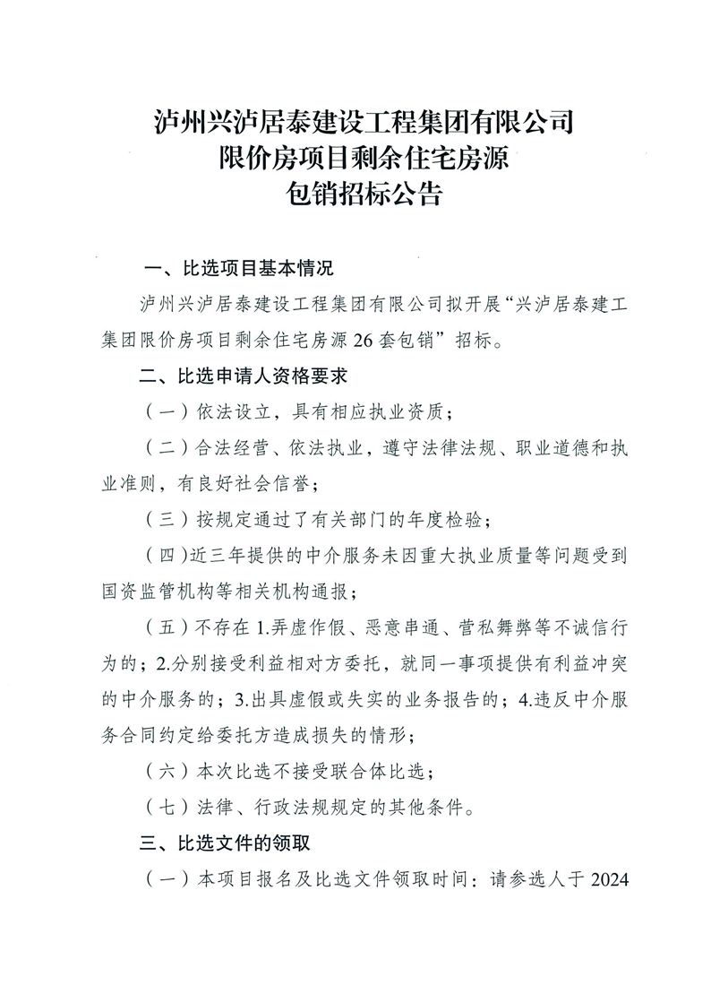 瀘州興瀘居泰建設(shè)工程集團(tuán)有限公司限價(jià)房項(xiàng)目剩余住宅房源包銷招標(biāo)公告 作者: 來(lái)源: 日期:2024-09-03 瀏覽次數(shù): 次 【字體:小 大】 【打印正文】