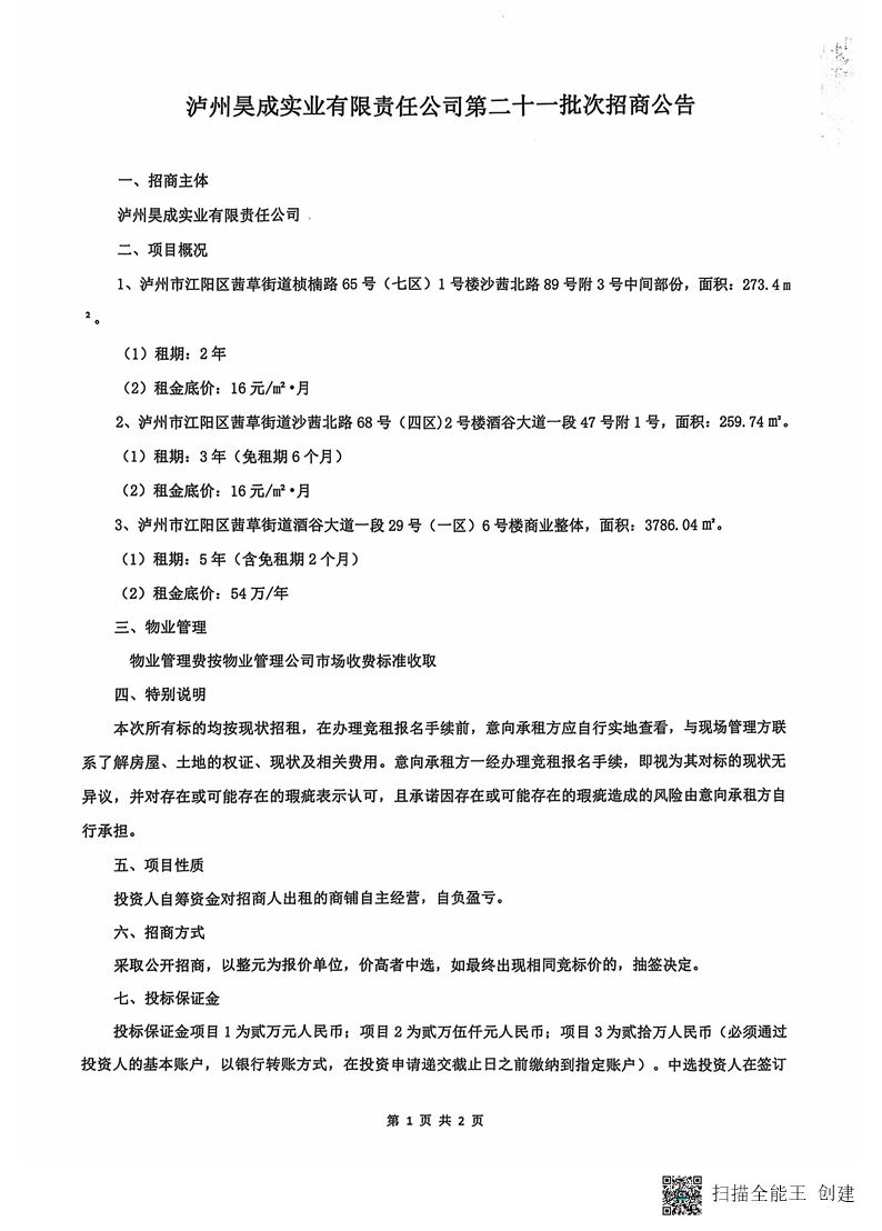 瀘州昊成實(shí)業(yè)有限責(zé)任公司第二十一批次招商公告