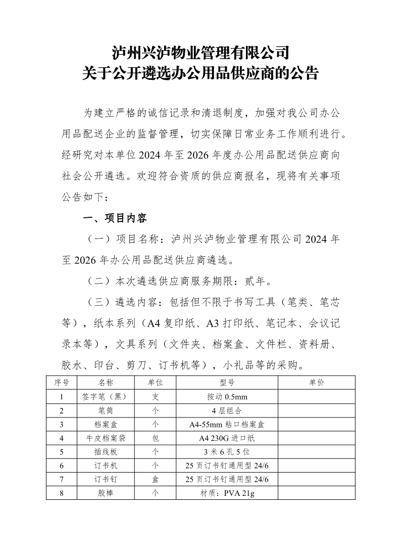 瀘州興瀘物業(yè)管理有限公司關(guān)于公開遴選辦公用品供應(yīng)商的公告
