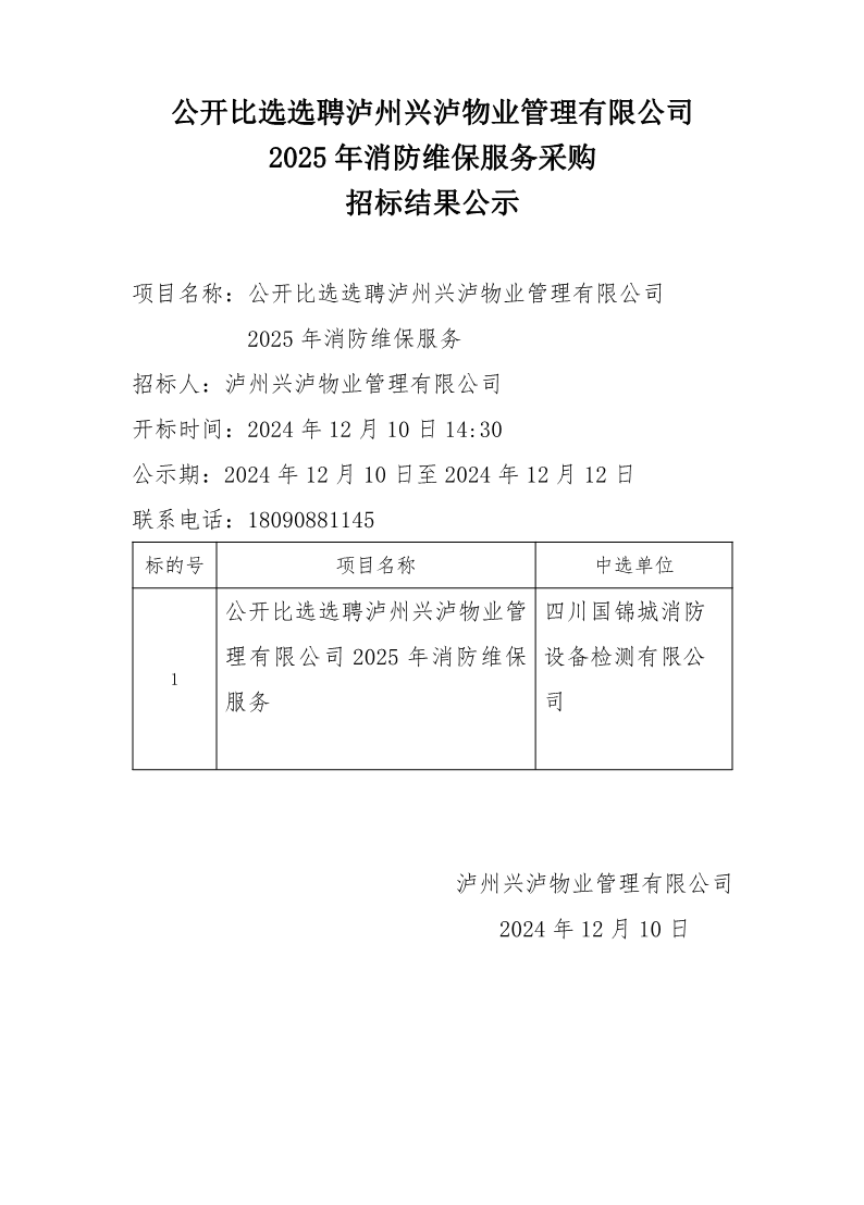 公開比選選聘瀘州興瀘物業(yè)管理有限公司2025年消防維保服務(wù)采購招標(biāo)結(jié)果公示 作者: 來源: 日期:2024-12-10 瀏覽次數(shù): 次 【字體:小 大】 【打印正文】