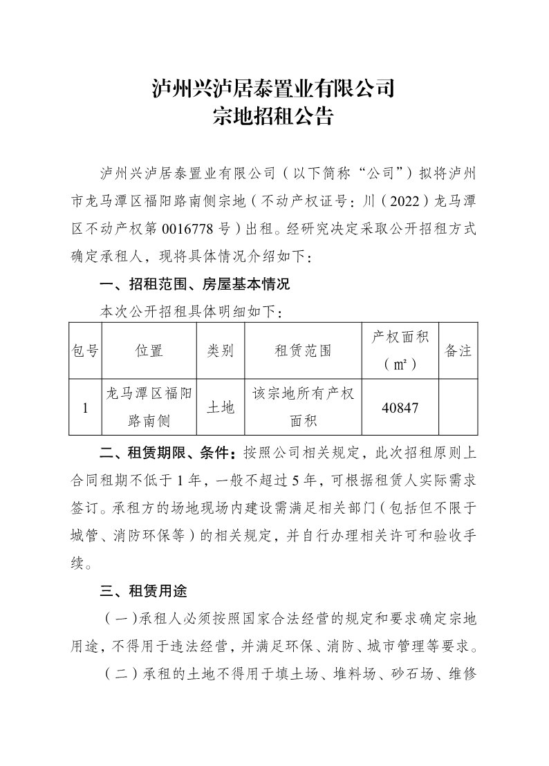 瀘州興瀘居泰置業(yè)有限公司宗地招租公告