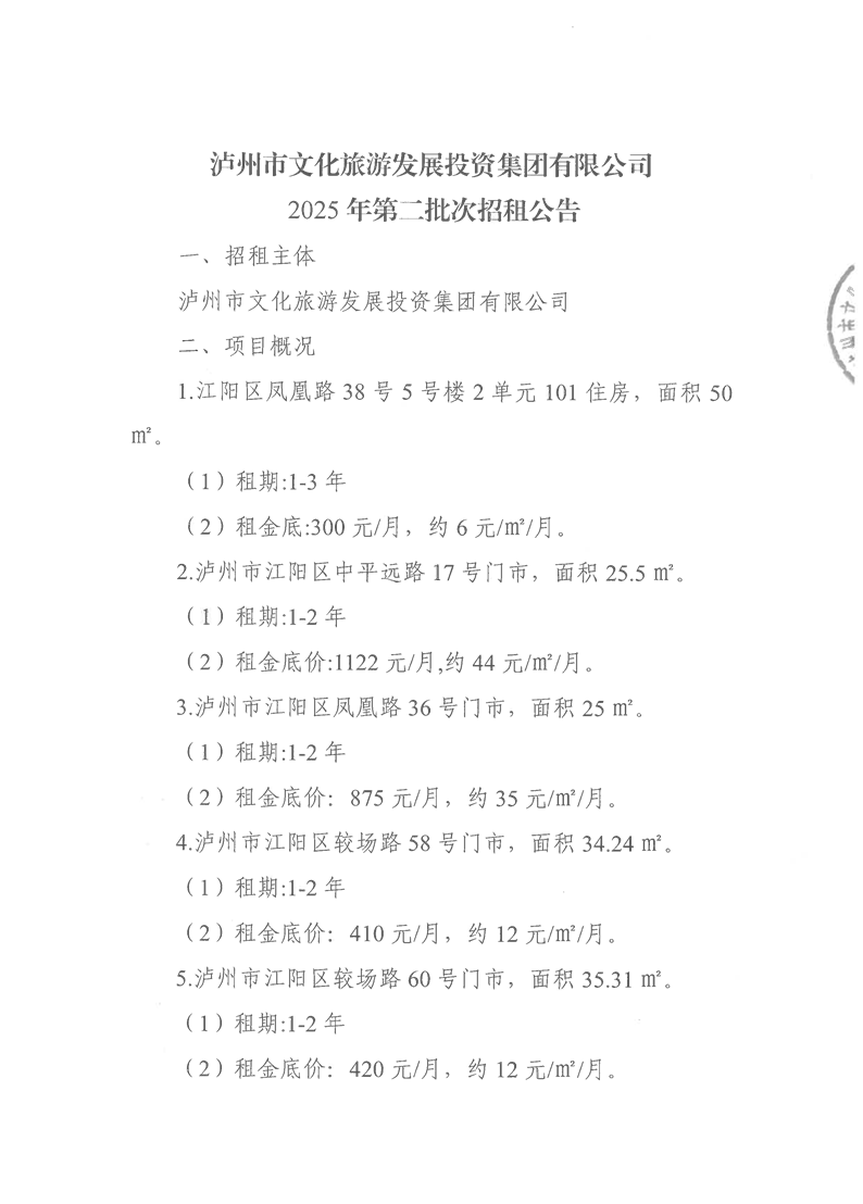 瀘州市文化旅游發(fā)展投資集團(tuán)有限公司2025年第二批次招租公告