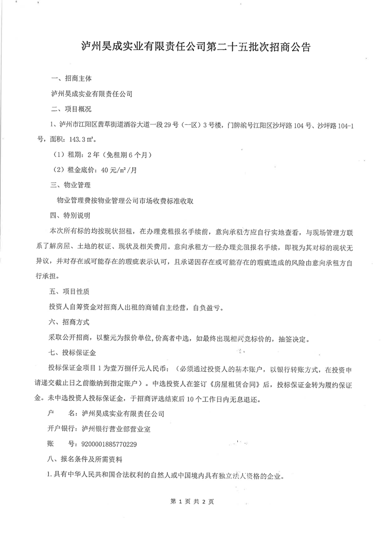 瀘州昊成實(shí)業(yè)有限責(zé)任公司第二十五批次招商公告