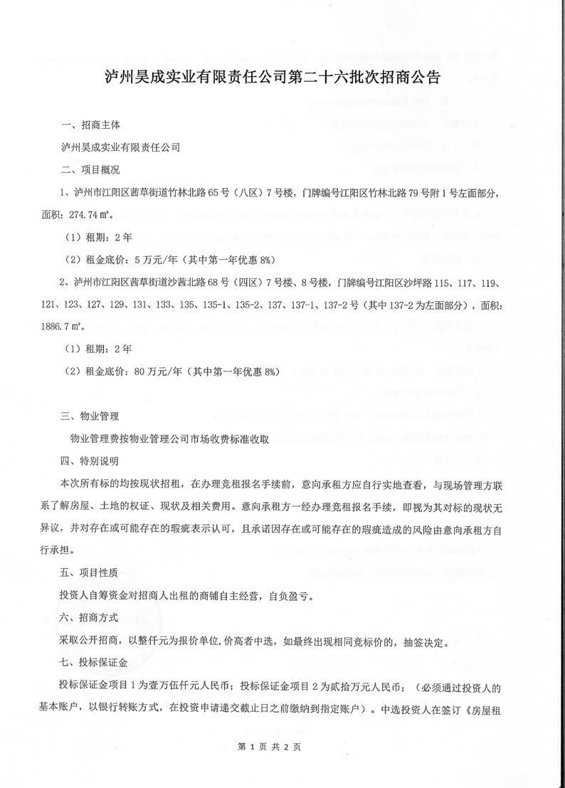 瀘州昊成實(shí)業(yè)有限責(zé)任公司第二十六批次招商公告