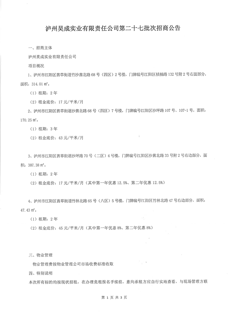 瀘州昊成實業(yè)有限責(zé)任公司第二十七批次招商公告