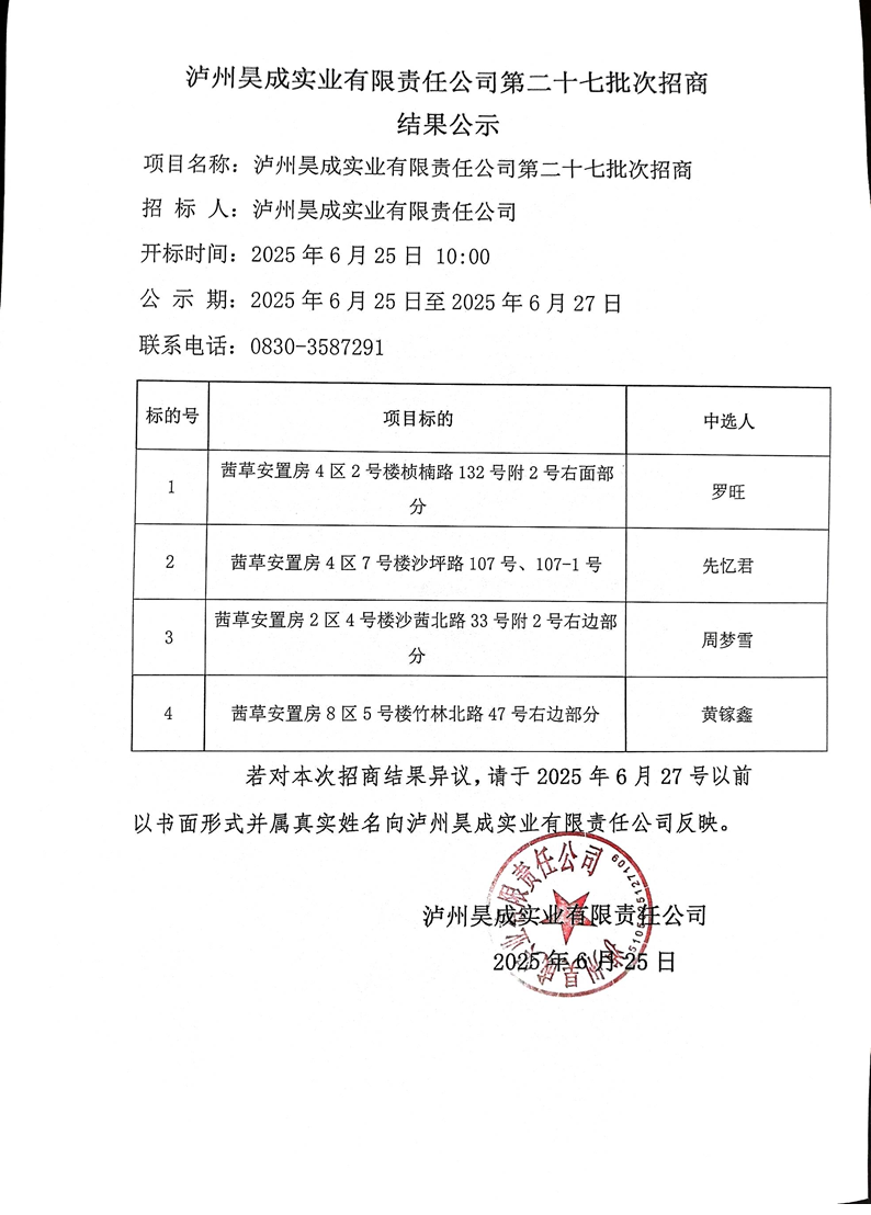 瀘州昊成實(shí)業(yè)有限責(zé)任公司第二十七批次招商結(jié)果公示