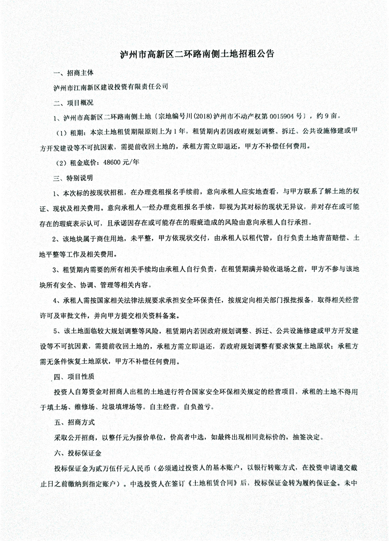 瀘州市高新區(qū)二環(huán)路南側(cè)土地招租公告
