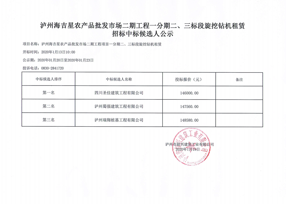 瀘州海吉星農(nóng)產(chǎn)品市場二期項目一分期二、三標段旋挖鉆機租賃招標中標候選人公示