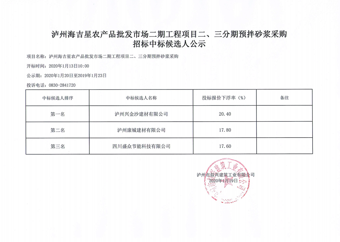 瀘州海吉星農產品市場二期項目二三分期預拌砂漿采購招標中標候選人公示