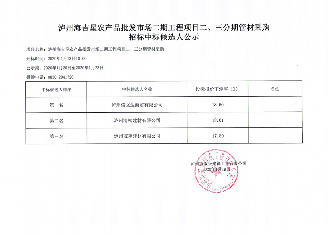 瀘州海吉星農(nóng)產(chǎn)品市場(chǎng)二期項(xiàng)目二三分期管材采購(gòu)招標(biāo)中標(biāo)候選人公示 作者: 來(lái)源: 日期:2020-01-19 瀏覽次數(shù): 次 【字體:小 大】 【打印正文】