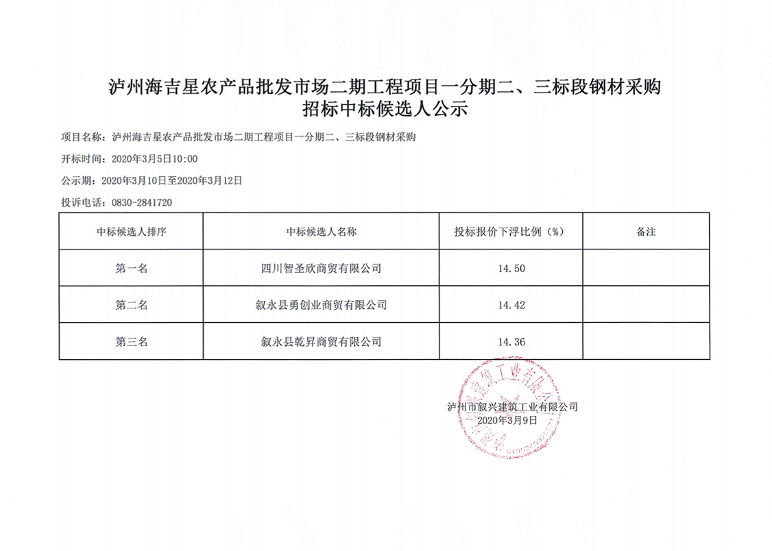瀘州海吉星農(nóng)產(chǎn)品批發(fā)市場(chǎng)二期項(xiàng)目一分期二、三標(biāo)段鋼材采購(gòu)招標(biāo)中標(biāo)候選人公示 作者: 來源: 日期:2020-03-09 瀏覽次數(shù): 次 【字體:小 大】 【打印正文】