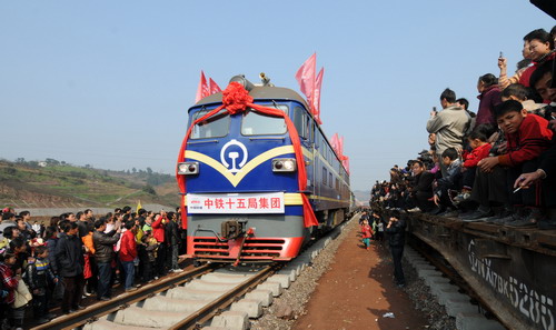 1月30日,農(nóng)歷大年初五,一列火車在陽光中緩緩開進敘永火車站,隨著市委書記、市人大常委會主任朱以莊,四川省鐵路集團公司董事長何興江,市委副書記、市長劉國強,市委副書記楊文杰,市委常委、副市長楊松柏,市委常委、市委秘書長喻雙為最后一接軌排擰緊螺栓,瀘州迎來了納敘鐵路全線貫通的大喜事。劉國強主持貫通儀式,并宣布納敘鐵路貫通。