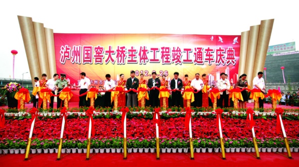 6月26日,興瀘集團(tuán)作為項(xiàng)目業(yè)主投資建設(shè)的國(guó)窖長(zhǎng)江大橋經(jīng)過(guò)3年多的艱苦努力,終于迎來(lái)了全市人民期盼已久的國(guó)窖長(zhǎng)江大橋竣工通車(chē)典禮。上午9時(shí),在歡慶的鑼鼓聲中,由市住房和城鄉(xiāng)建設(shè)局、興瀘集團(tuán)主辦的國(guó)窖長(zhǎng)江大橋主體工程竣工通車(chē)慶典在大橋東岸橋面舉行。市委書(shū)記劉國(guó)強(qiáng),市委副書(shū)記、市長(zhǎng)劉強(qiáng)等市領(lǐng)導(dǎo)為大橋通車(chē)揭幕、剪彩,省住建廳、國(guó)家開(kāi)發(fā)銀行四川省分行領(lǐng)導(dǎo)、興瀘集團(tuán)董事長(zhǎng)、總經(jīng)理黃毅等有關(guān)單位以及市級(jí)有關(guān)部門(mén)、單位負(fù)責(zé)人和施工單位代表等出席通車(chē)慶典。